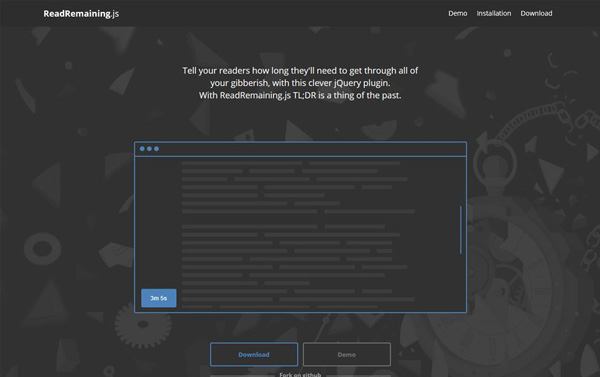 這是一個JQuery插件的網頁設計,它保留了充足的大量黑色背景圖的負空間,配合亮藍的前景色和純白的文字設計,提升了整個頁面的清晰度,讓這些元素更加易于辨認。