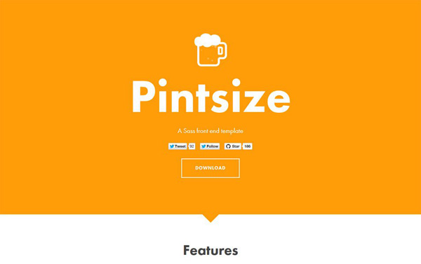 Pintsize 同樣是一款 Web 框架產品,其網頁設計采用了大面積的橙色負空間,Logo和下載按鈕的純白色設計,能夠讓訪客很容易記住它,并能輕松地找到自己想要的東西。