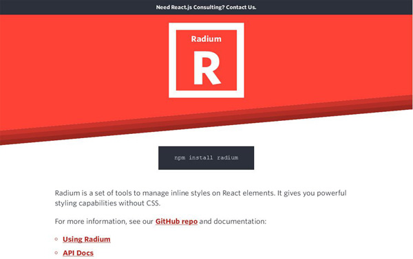Radium 是一個用來管理內聯樣式的工具,它可以在CSS之外提供更為強大的功能。Radium 的網頁設計中,上半部分保留了充足的紅色負空間,而下半部分使用了白色負空間,使整個頁面感覺錯落有致,Logo清晰可見。