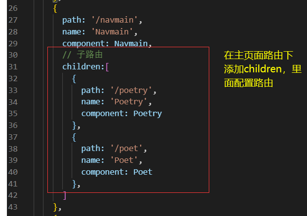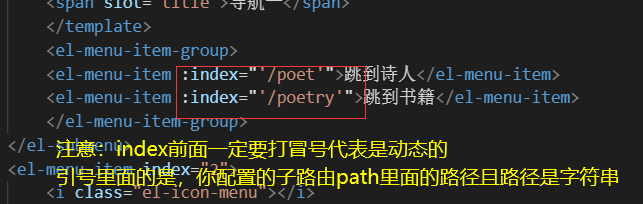 5.在配置好子路由后,就可以在導航菜單欄中使用,使用時只需對index設(shè)置需要跳轉(zhuǎn)頁面路徑就行了,如下圖: